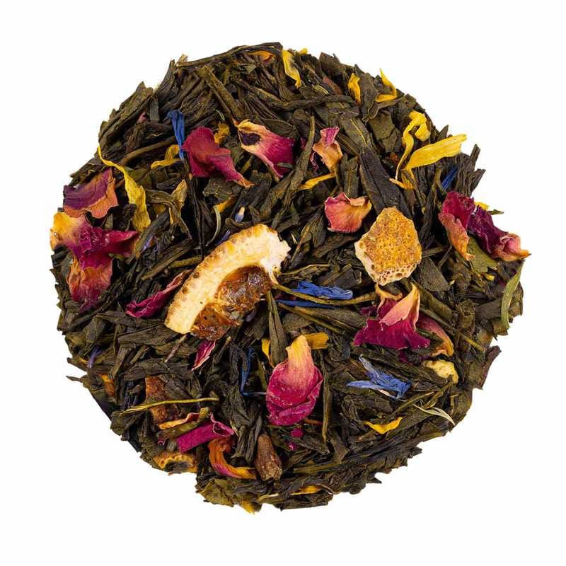 Zutaten: Grüner Tee China Sencha, Mango (Mango, Zucker), Orangenschalen, Rosenblüten, Orangenecken, natürliches Orangen Aroma, natürliches Aroma, Ringelblumen, Physalis, Kornblumen blau.